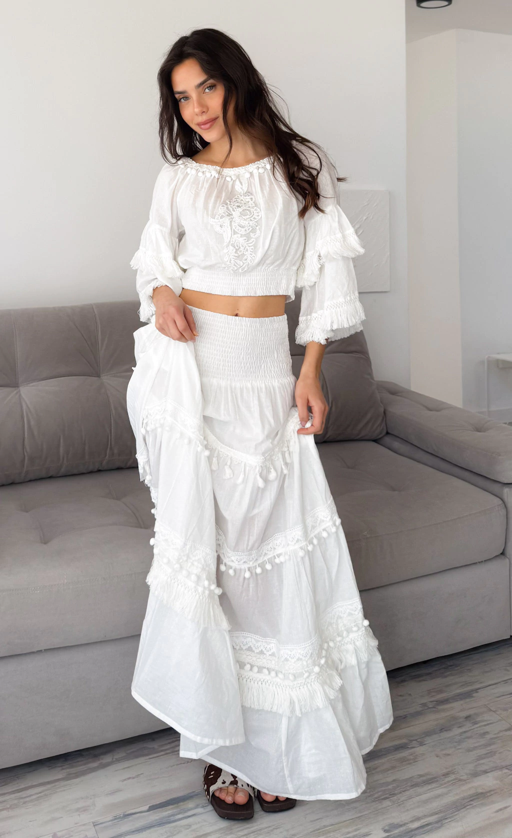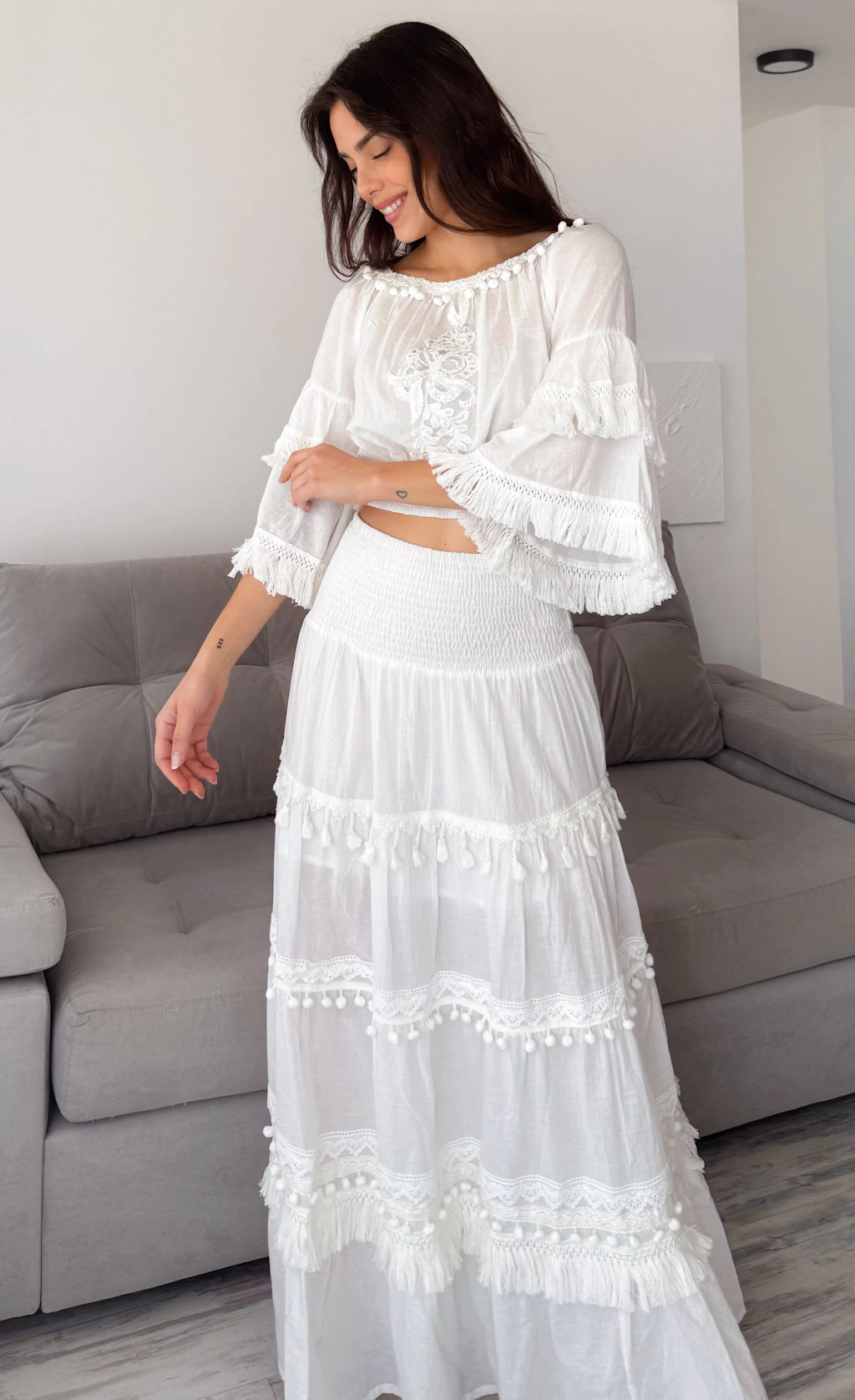 La pollera larga se destaca por sus galones de broderie, flecos y borlas, con una cintura elastizada en panal de abeja que se adapta perfectamente a tu cuerpo, brindando libertad de movimiento sin perder la forma.
