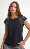 Esta remera es perfecta para quienes buscan una prenda versátil que combine con jeans, faldas o pantalones de vestir, aportando un detalle brillante que realza cualquier outfit. La calidad de sus materiales y el diseño exclusivo la convierten en una pieza imprescindible en tu guardarropa.