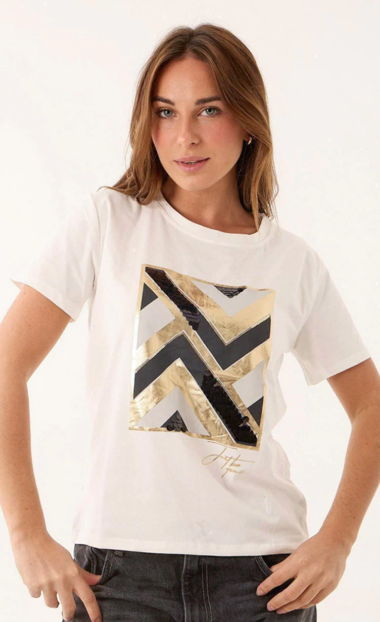 Descubrí la Remera Marks, una prenda premium confeccionada en algodón con lycra que garantiza una sensación suave y un ajuste perfecto a tu cuerpo. Su diseño incluye una exclusiva estampa metalizada combinada con un delicado bordado de lentejuelas que aporta un brillo sutil y sofisticado, ideal para quienes buscan destacar con estilo.