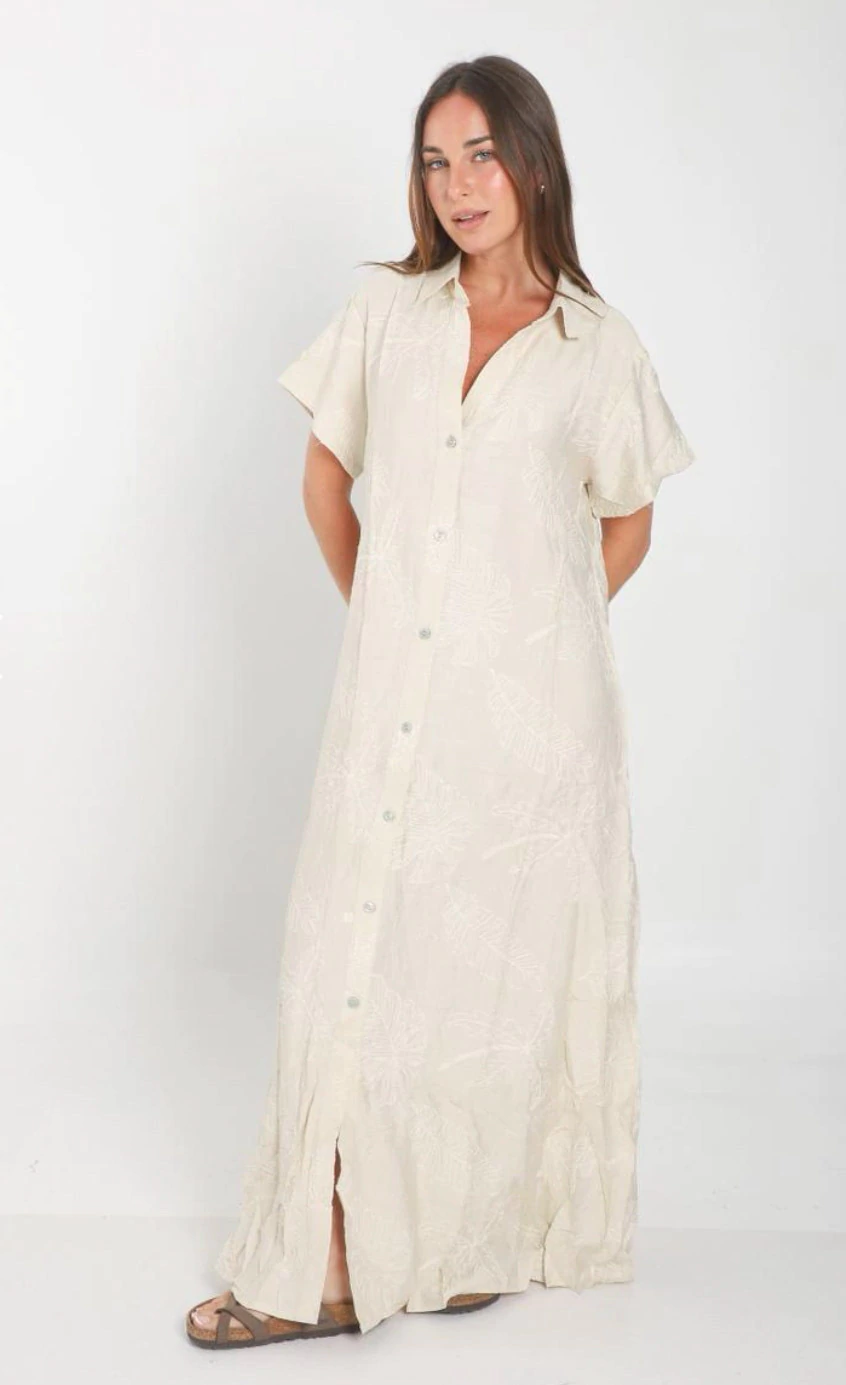Vestido Camisero Premium de Lino Bordado con hojas, super amplio oversize, con bolsillos.